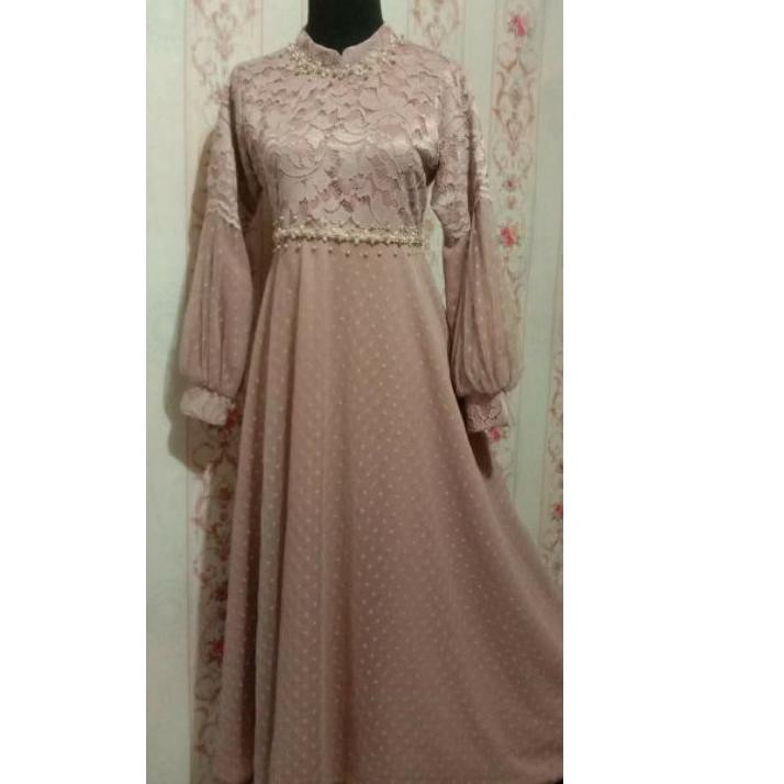 16.000/m & lebar 150 cm, beli minimal 10 meter ada harga khusus) karakter kain tile lembut ini sangat halus dan lemes ketika dipegang karena itu tile ini sangat cocok untuk bahan pakaian yang diperuntukkan untuk acara resmi seperti kebaya maupun dalaman brokat. Tille bordir ceplok bunga, bisa untuk dress / aplikasi dengan mengambil bordirnya saja. Jika terkena sinar matahari warna tile akan sangat putih (bisa berubah warna tergantung tingkat lumen cahaya) warna telah diolah semirip mungkin dengan produk aslinya (90%) Gaun pesta muslimah silmpel yang menawan; Tambahan kombinasi hinggga menggunakan 3 jenis kain juga tidak masalah asalkan anda dapat mengkombinasikan.